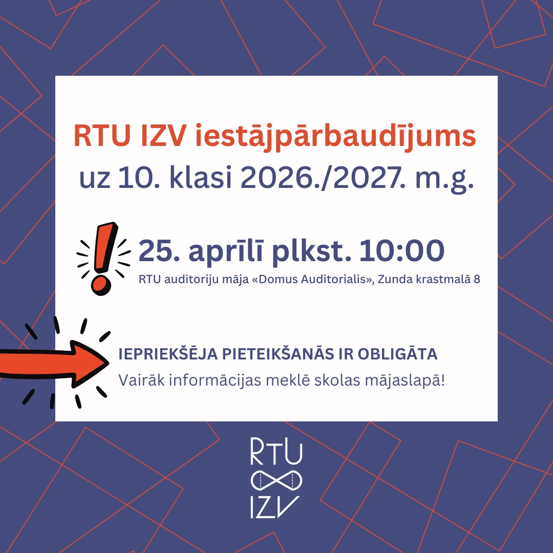 RTU IZV izsludina pieteikšanos iestājpārbaudījumam uz 10. klasi 2026./2027.m.g., kas norisināsies 25. aprīlī no 10:00 līdz 13:00 RTU auditoriju māja «Domus Auditorialis», Zunda krastmalā 8.